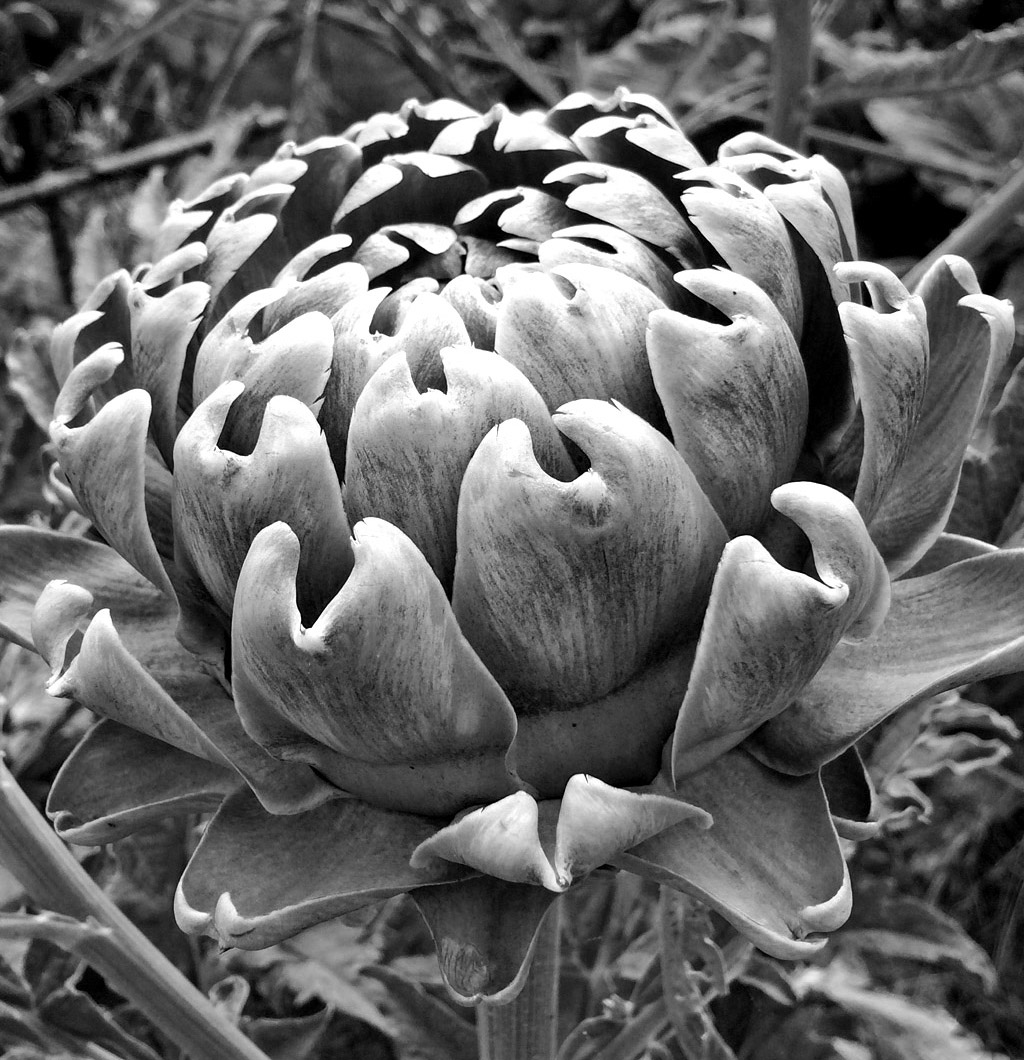 While I was editing, I remembered a picture of some artichoke garden art from the Hampton Court Flower Show and tried to disguise another distracting background by converting the image to black and white. The Photoshop texture effect was just an instinct: I wanted to soften the heavy bluntness of the metal compared to the living flower bud.