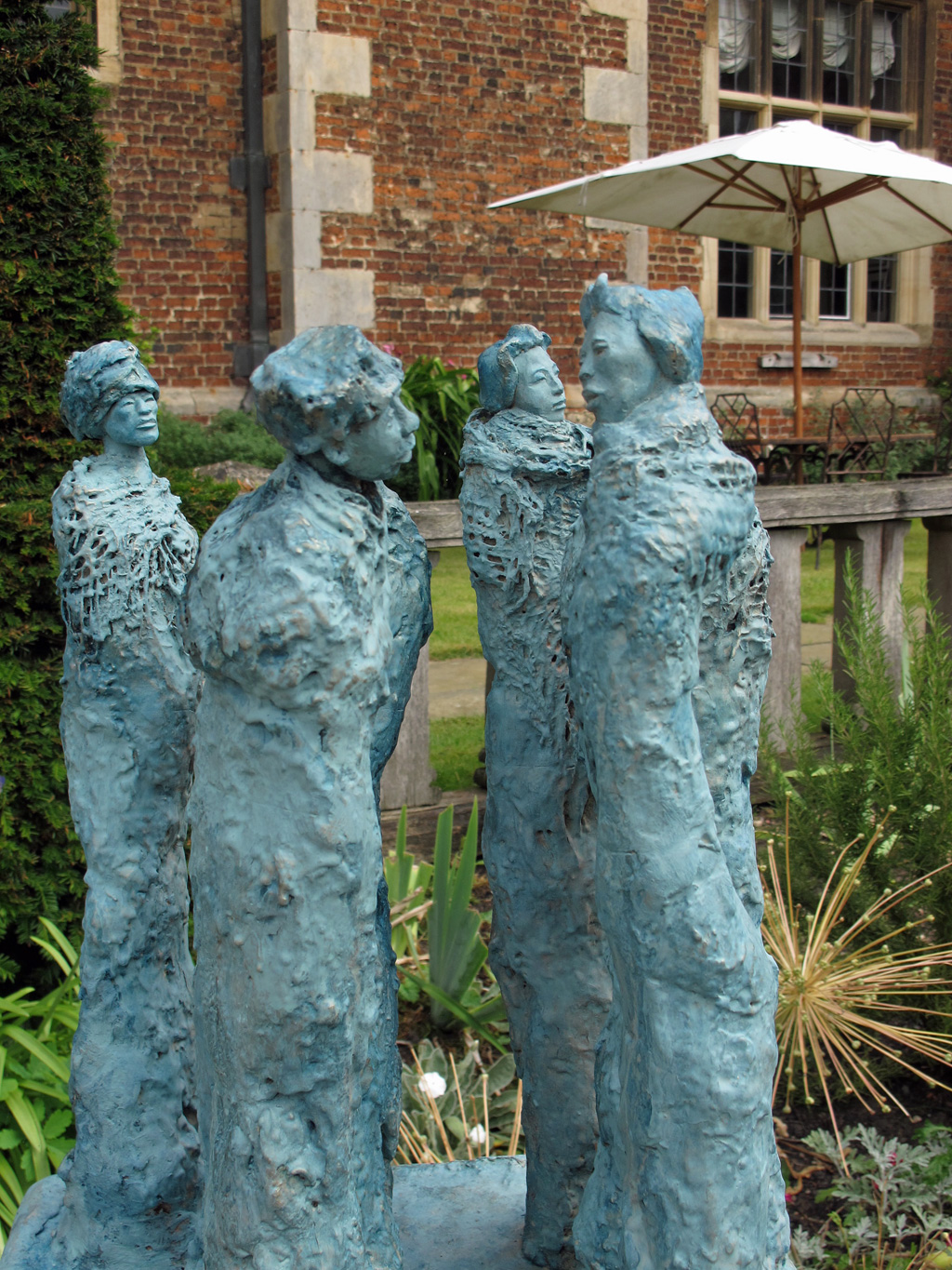 We found the artwork placed on a table near the patio at Doddington Hall Gardens during a garden art exhibition a few years ago. I was struck by so much about it: the storytelling, textures, stylisation, and the verdigris colour; the way some of the details were picked out, while other parts were deftly glossed over. You may not get a sense of the scale from my pictures: the beautifully studied, slightly elongated figures were only 16″ (40 cm) or so high.