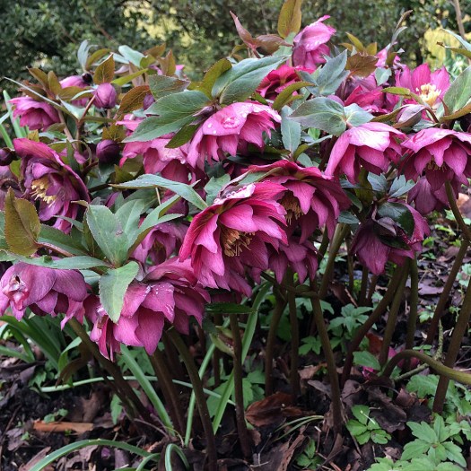 You might have noticed that the petals are slightly rounder and more wavy at the tips than the flowers in the main clump with their sharply pointed petals. Not by much, but enough to suggest this could be a slightly different Helleborus x hybridus on the edge or in the middle of the clump. If it’s a stray seedling, it’s a particularly beautiful one.