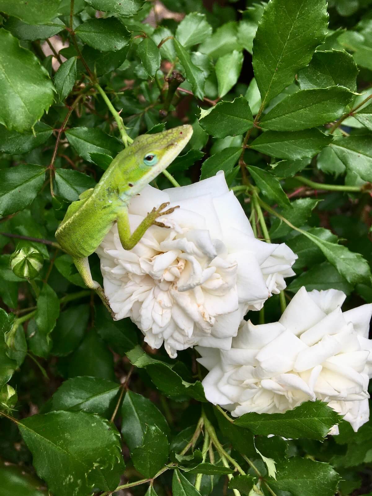 Anole on a white rose