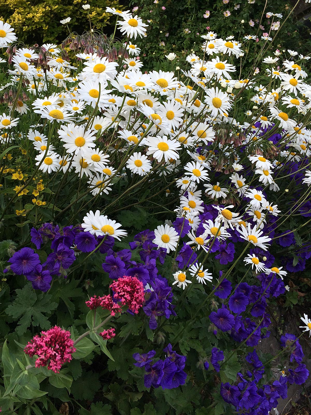 White daisies underplanted with geraniums