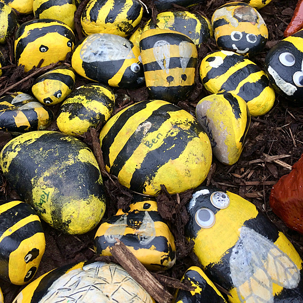 Hand painted stone bees A path of stone bees on the David Hockney inspired Garden at Tatton Park by Bexton Primary School