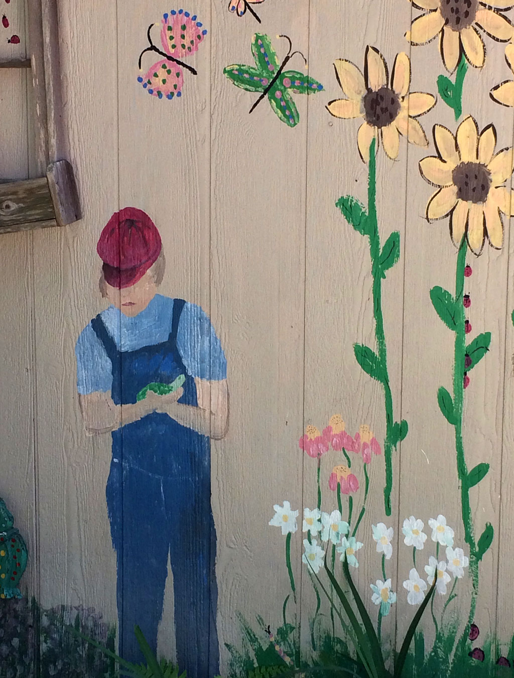 A painting of Peck Cranston with tortoise, flowers and butterflies